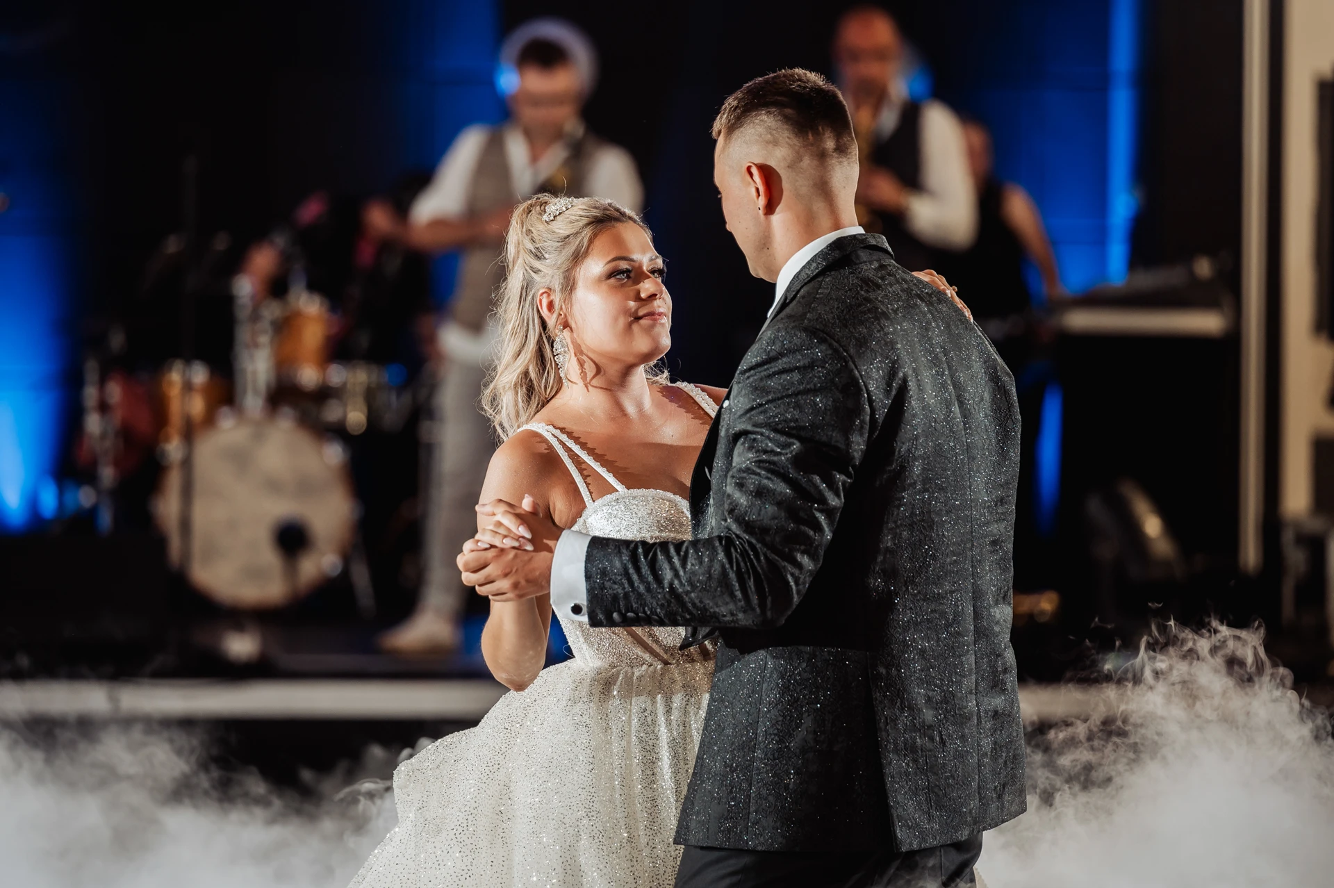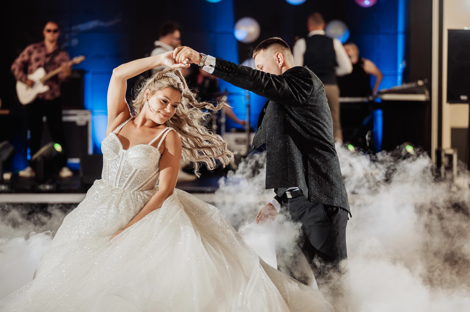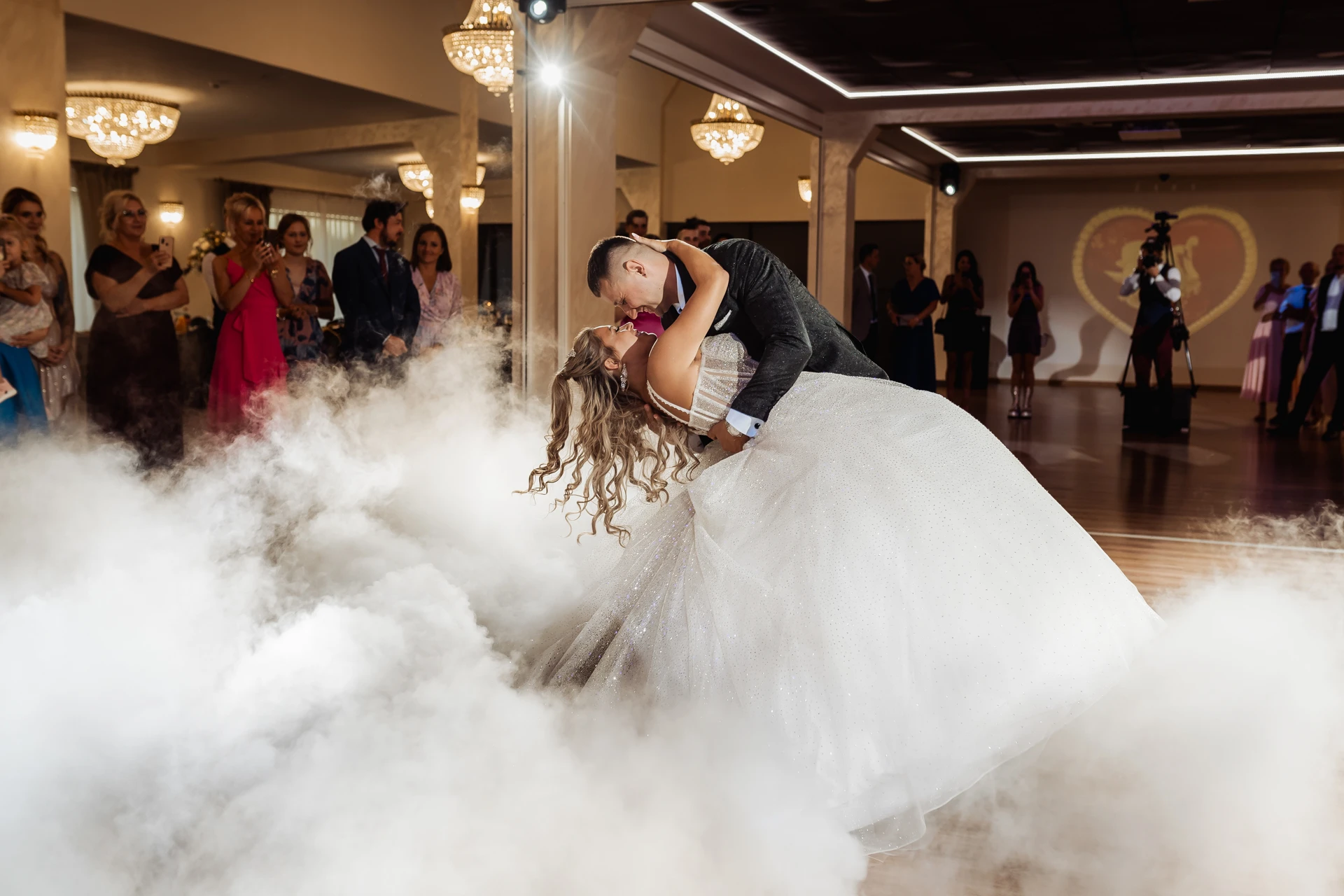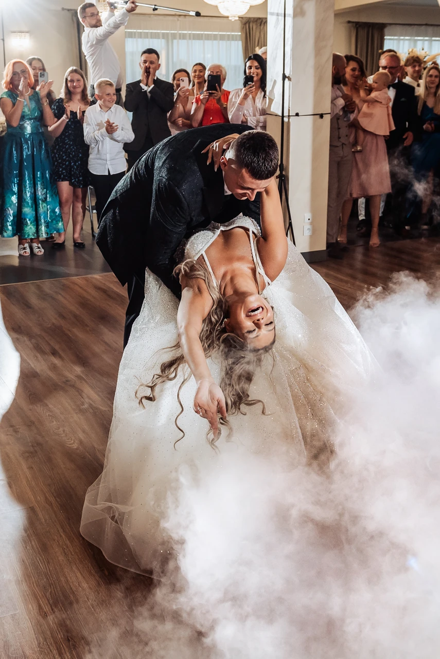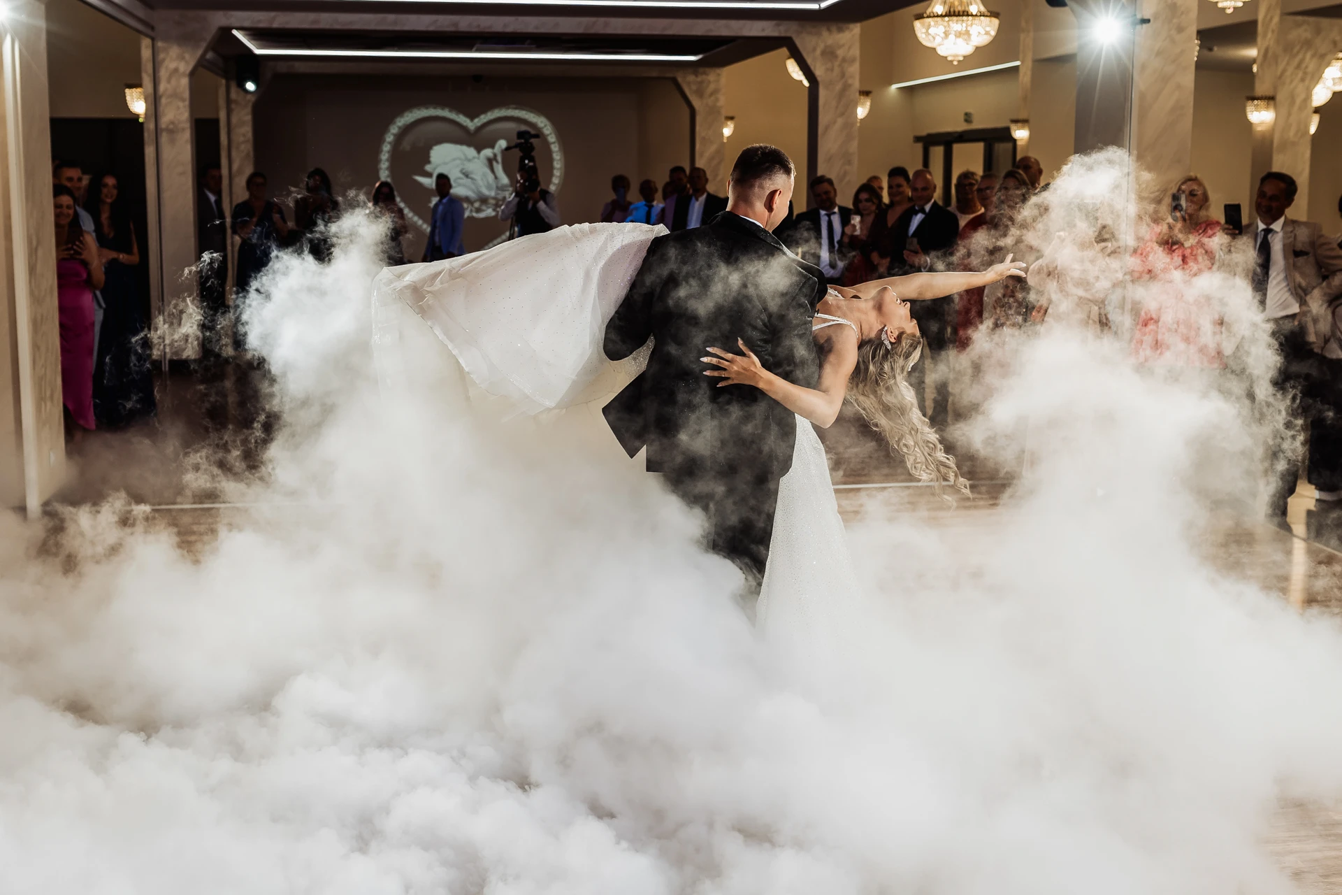 Pierwszy taniec Patrycji i Patryka odbył się w kłębach ciężkiego dymu, co stworzyło bajkowy efekt. Goście patrzyli z zachwytem, a ich radość i miłość były widoczne w każdym geście.