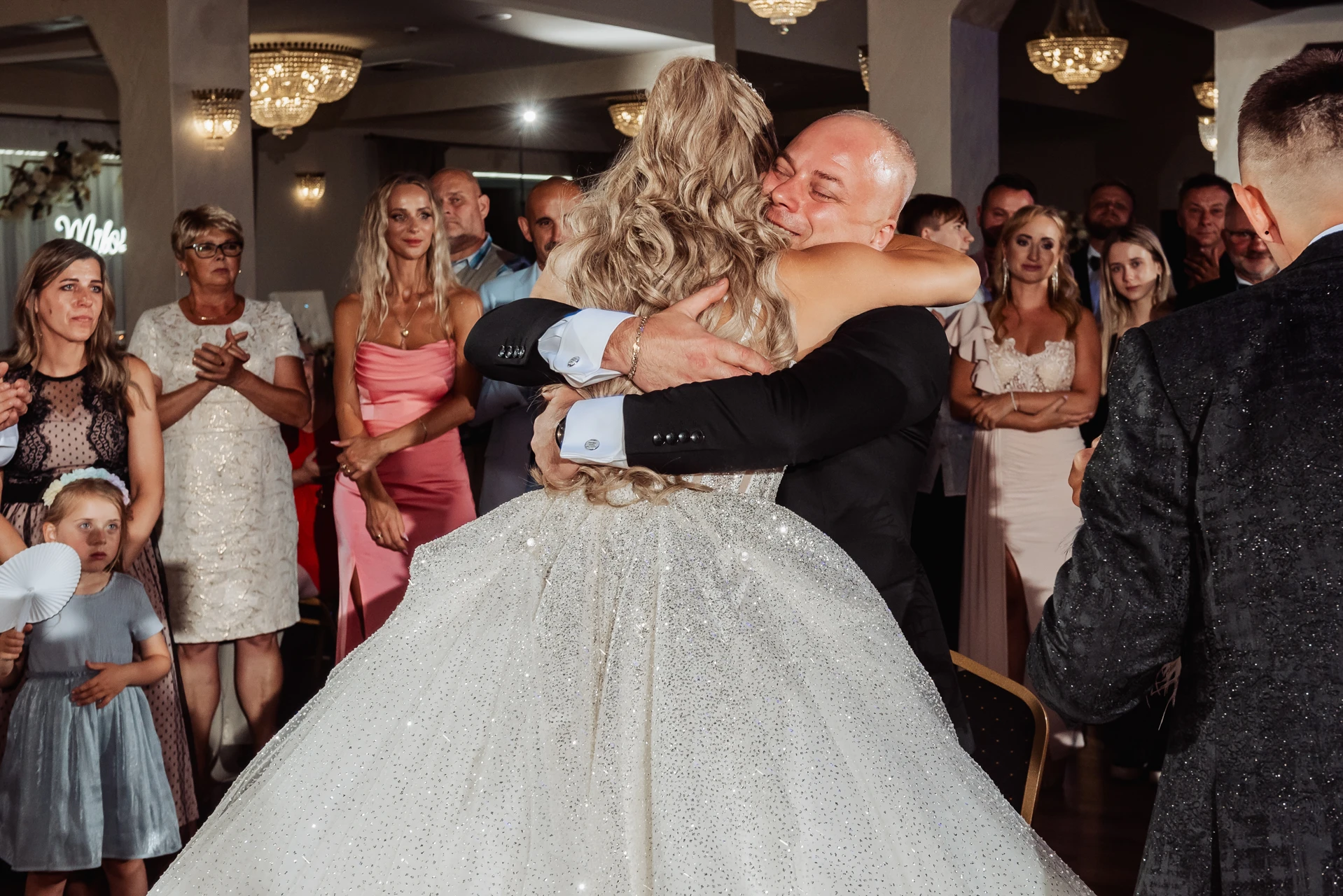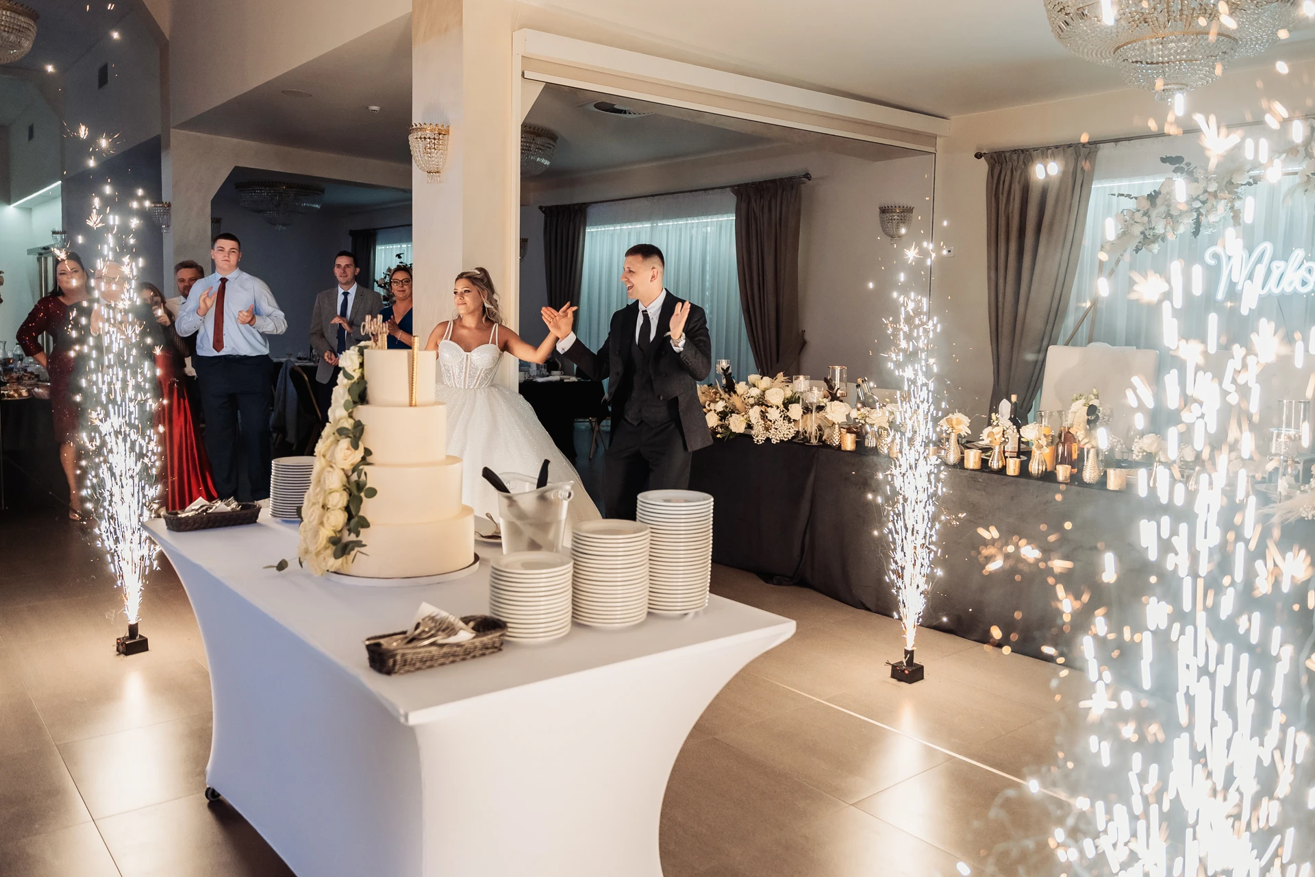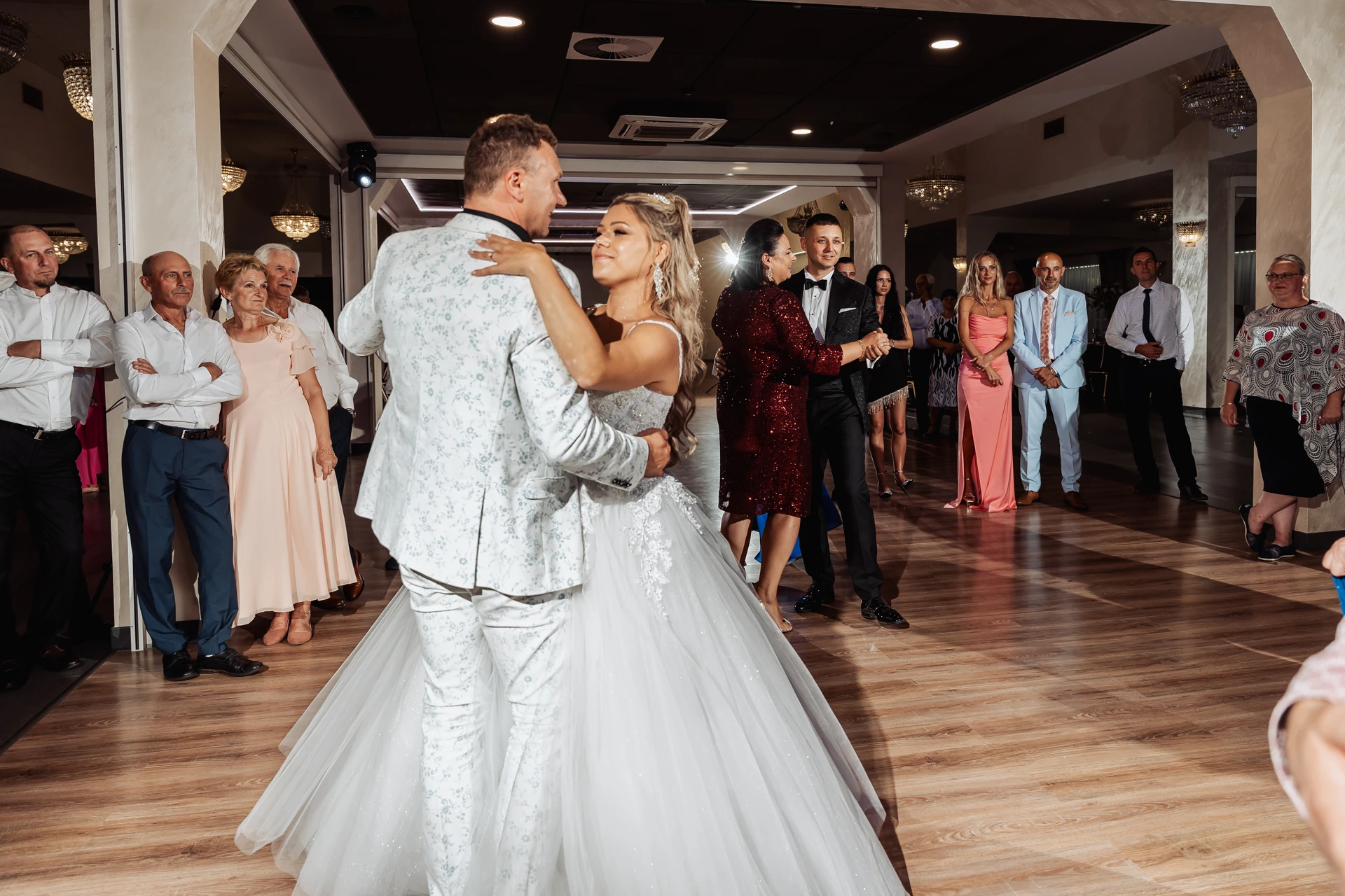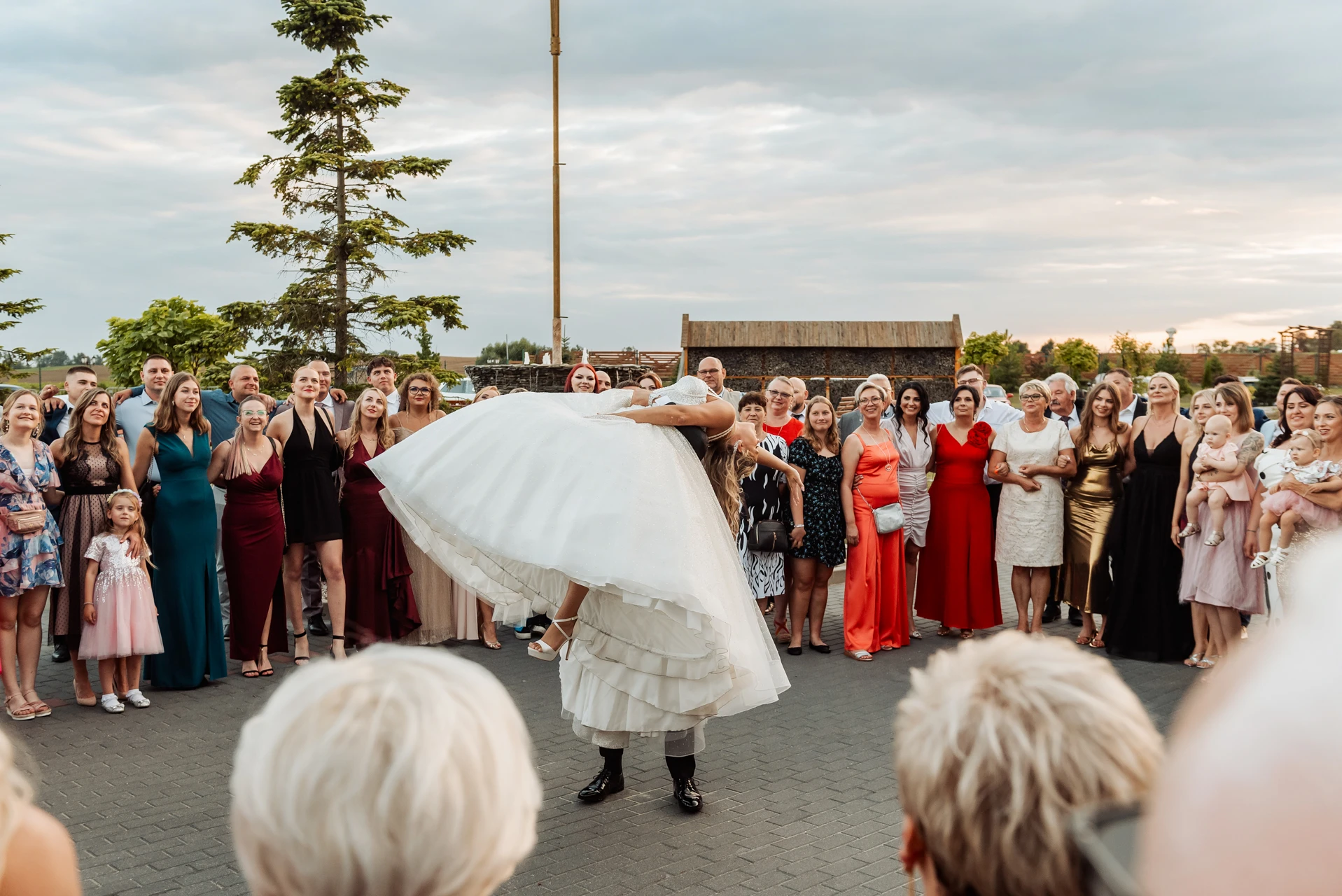 Pierwszy taniec Patrycji i Patryka odbył się w kłębach ciężkiego dymu, co stworzyło bajkowy efekt. Goście patrzyli z zachwytem, a ich radość i miłość były widoczne w każdym geście.