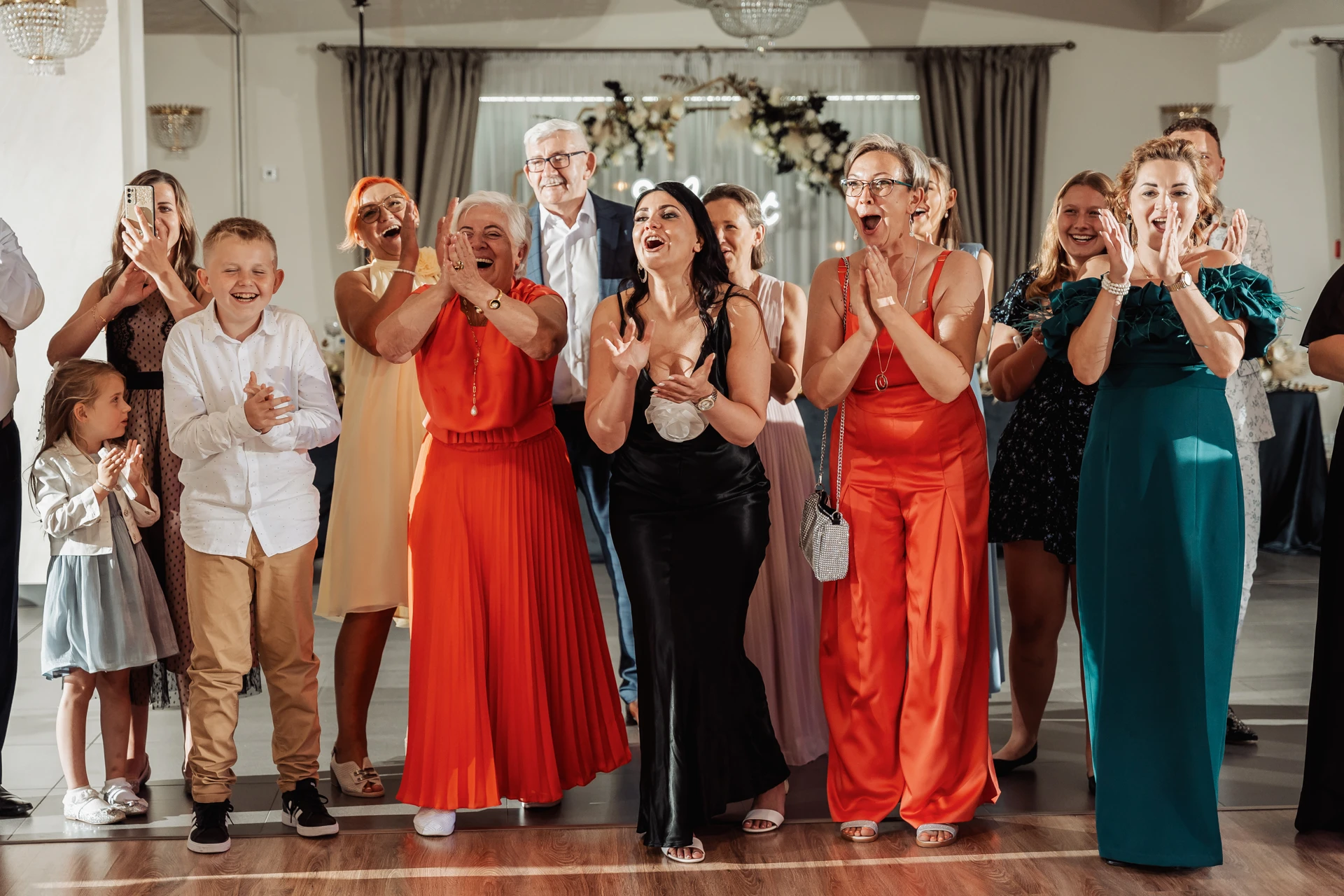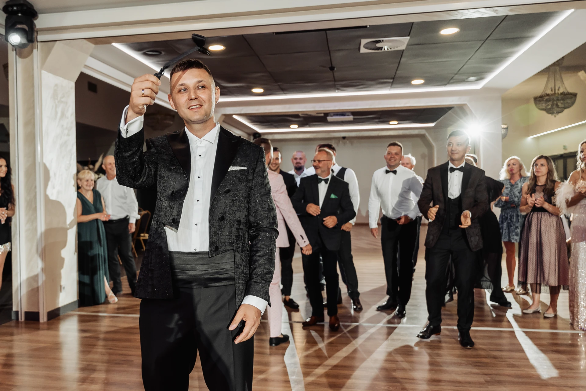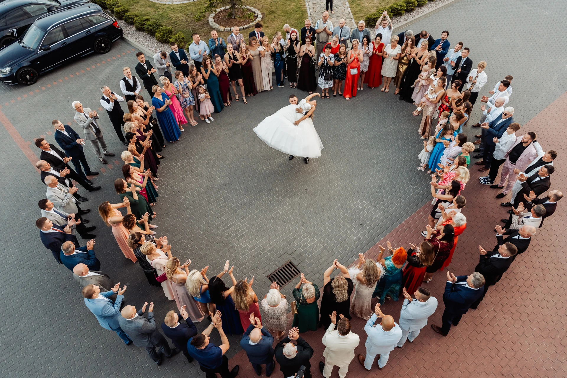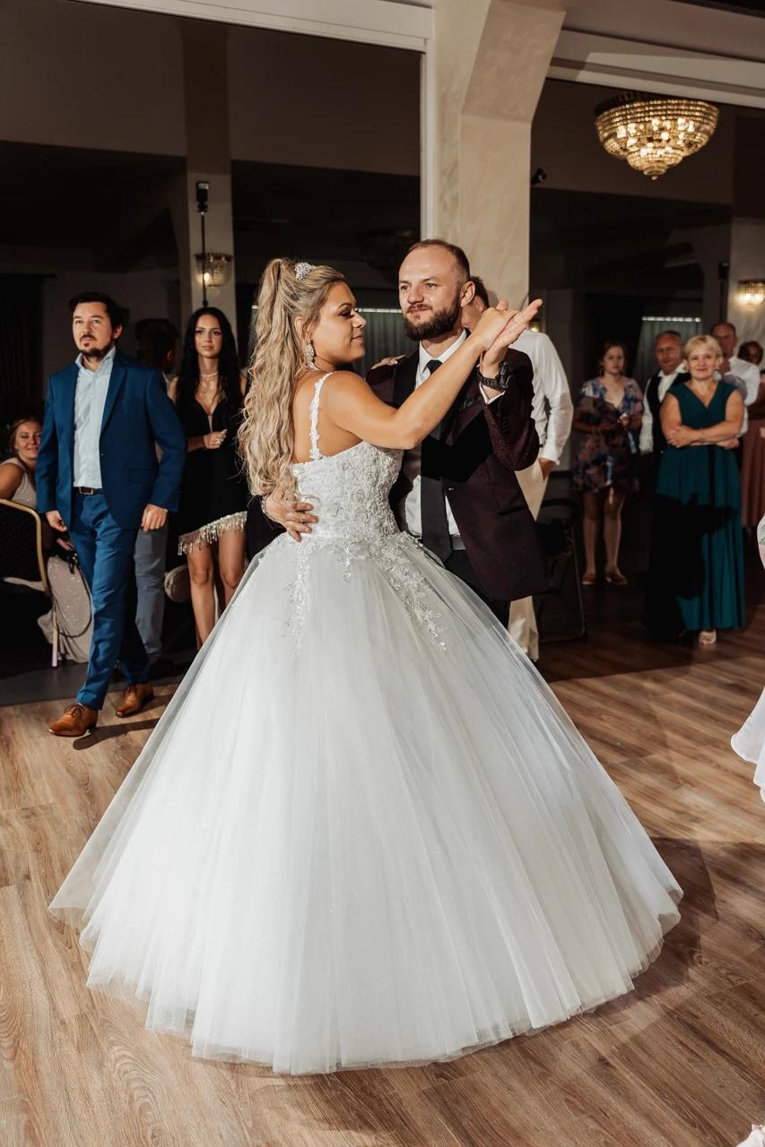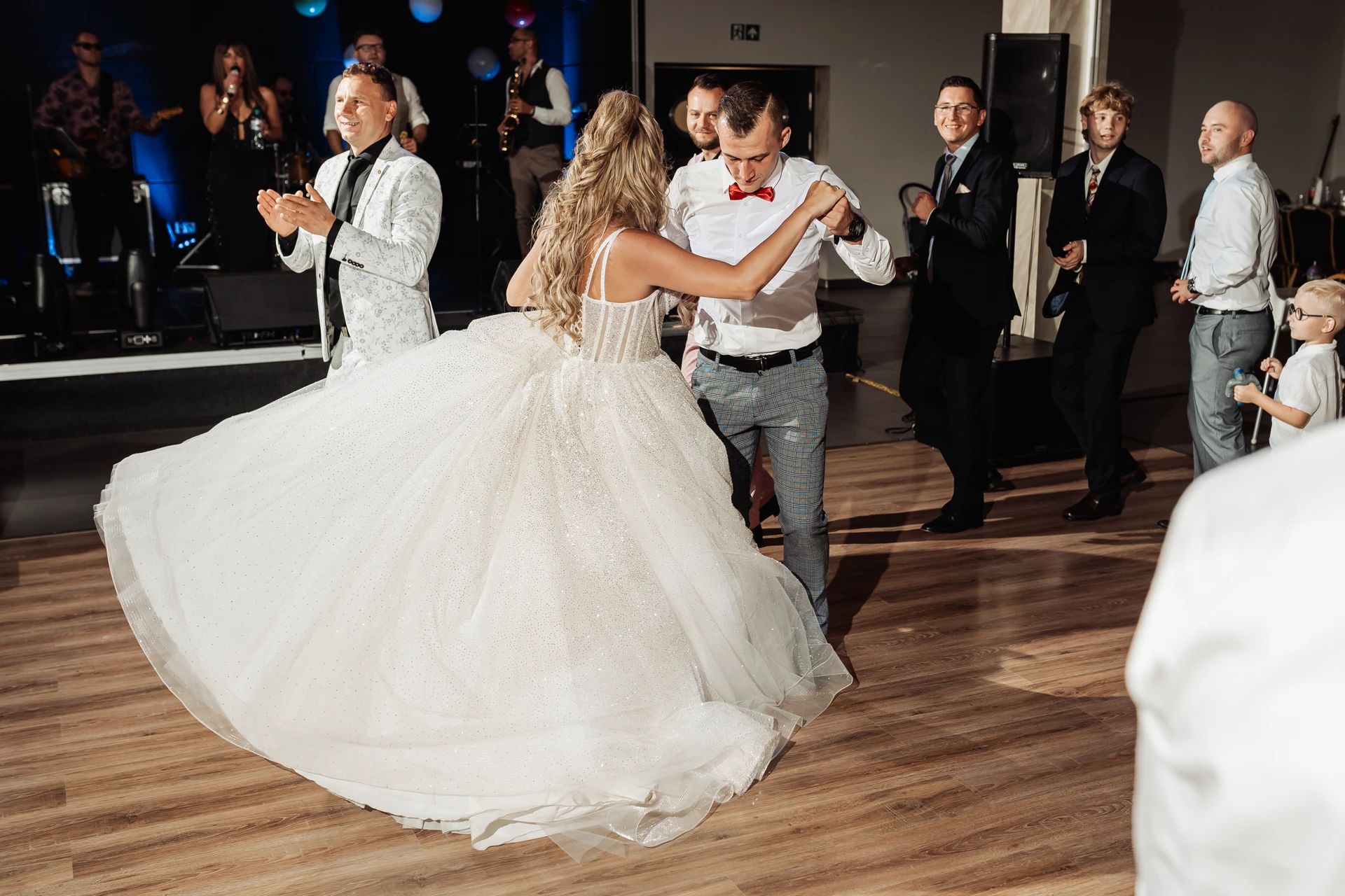Pierwszy taniec Patrycji i Patryka odbył się w kłębach ciężkiego dymu, co stworzyło bajkowy efekt. Goście patrzyli z zachwytem, a ich radość i miłość były widoczne w każdym geście.