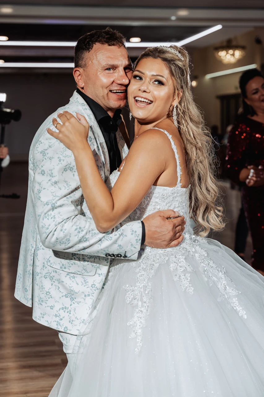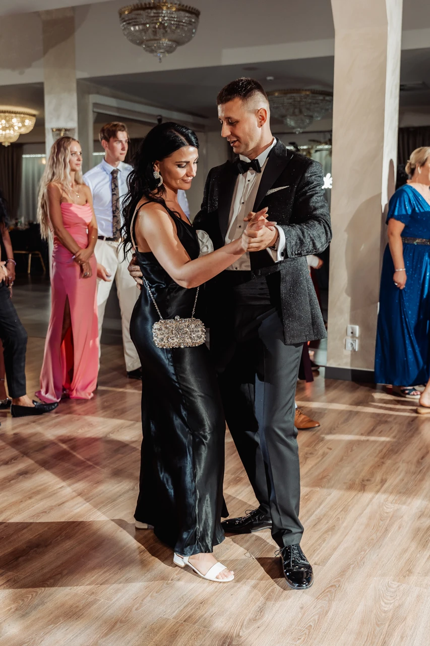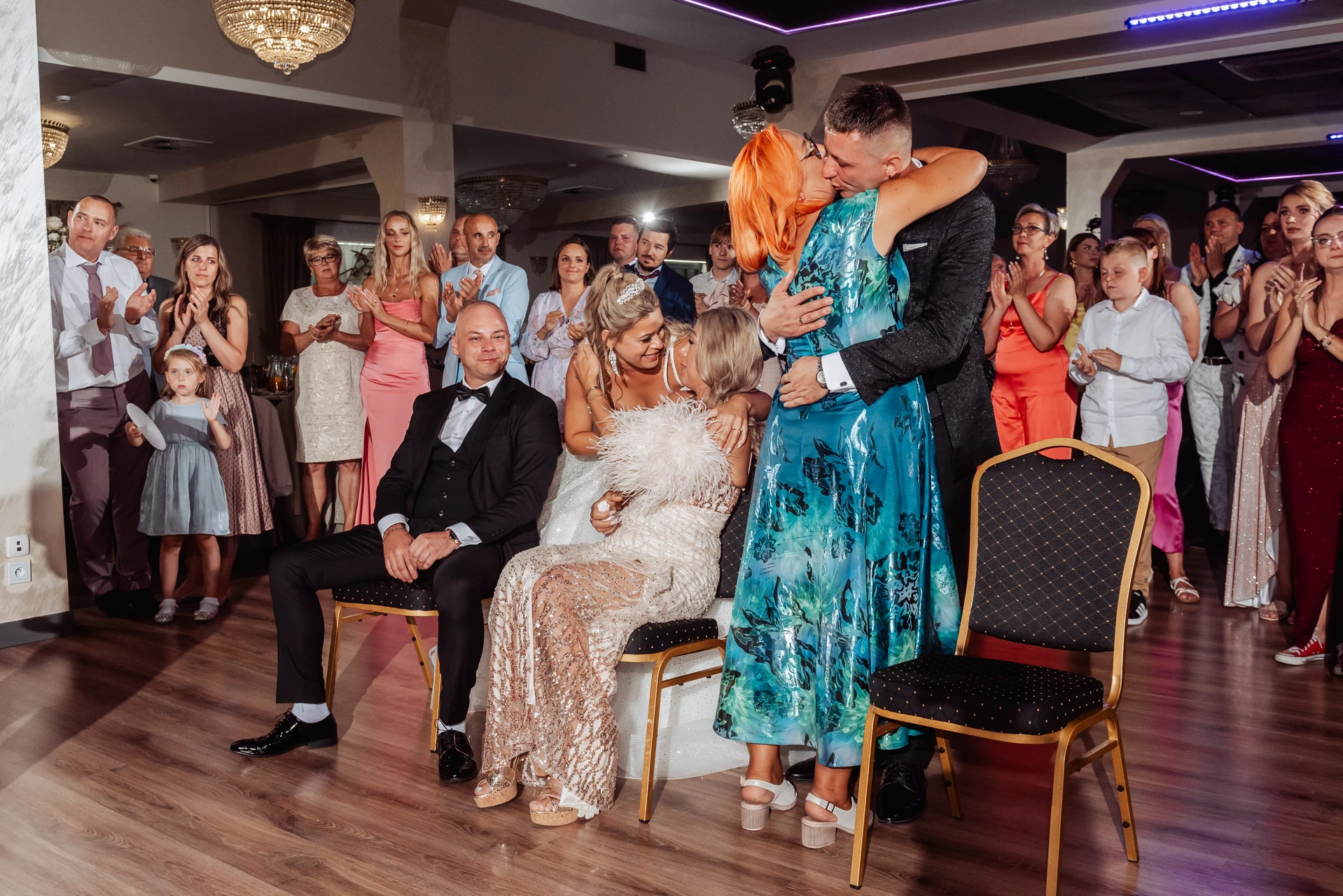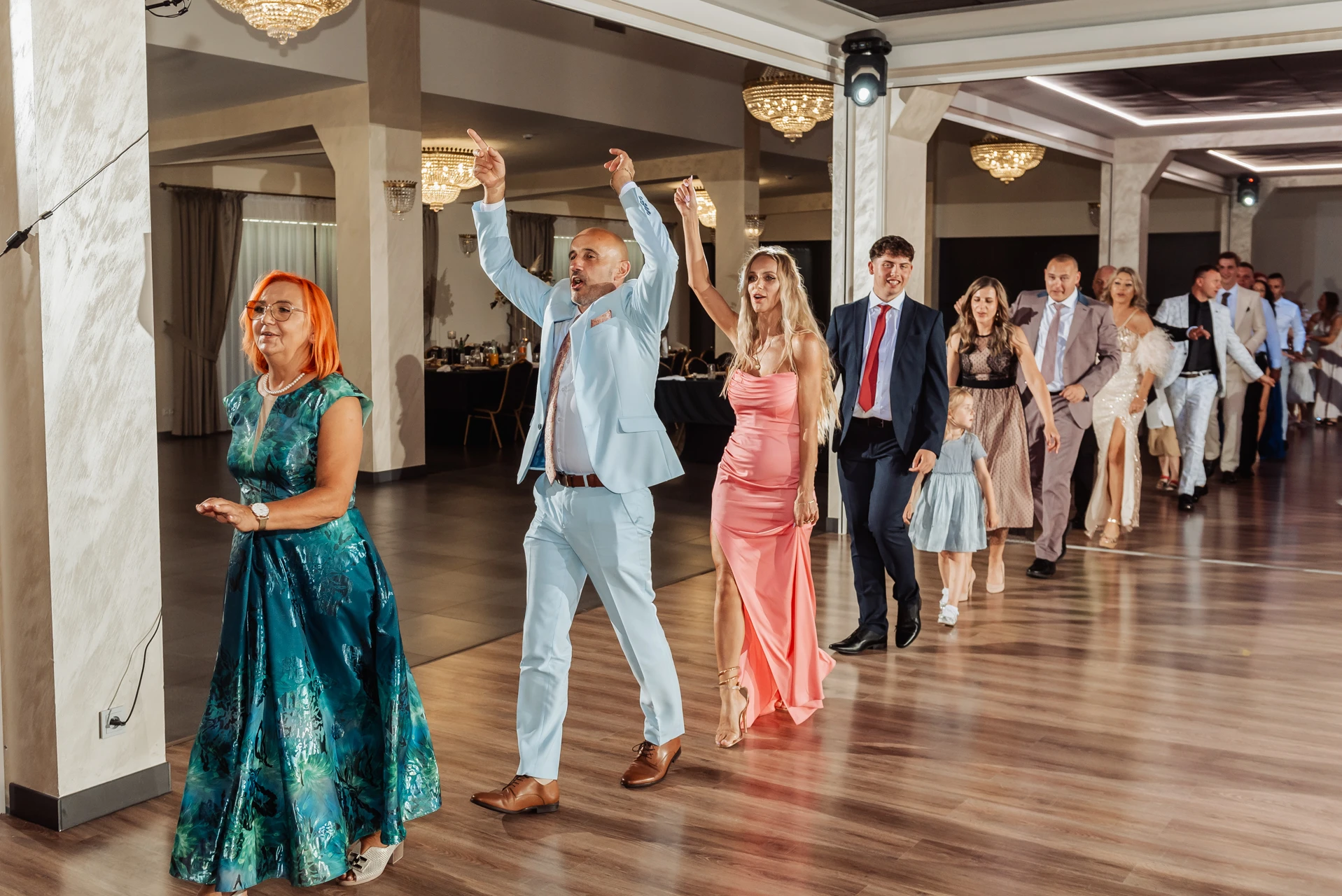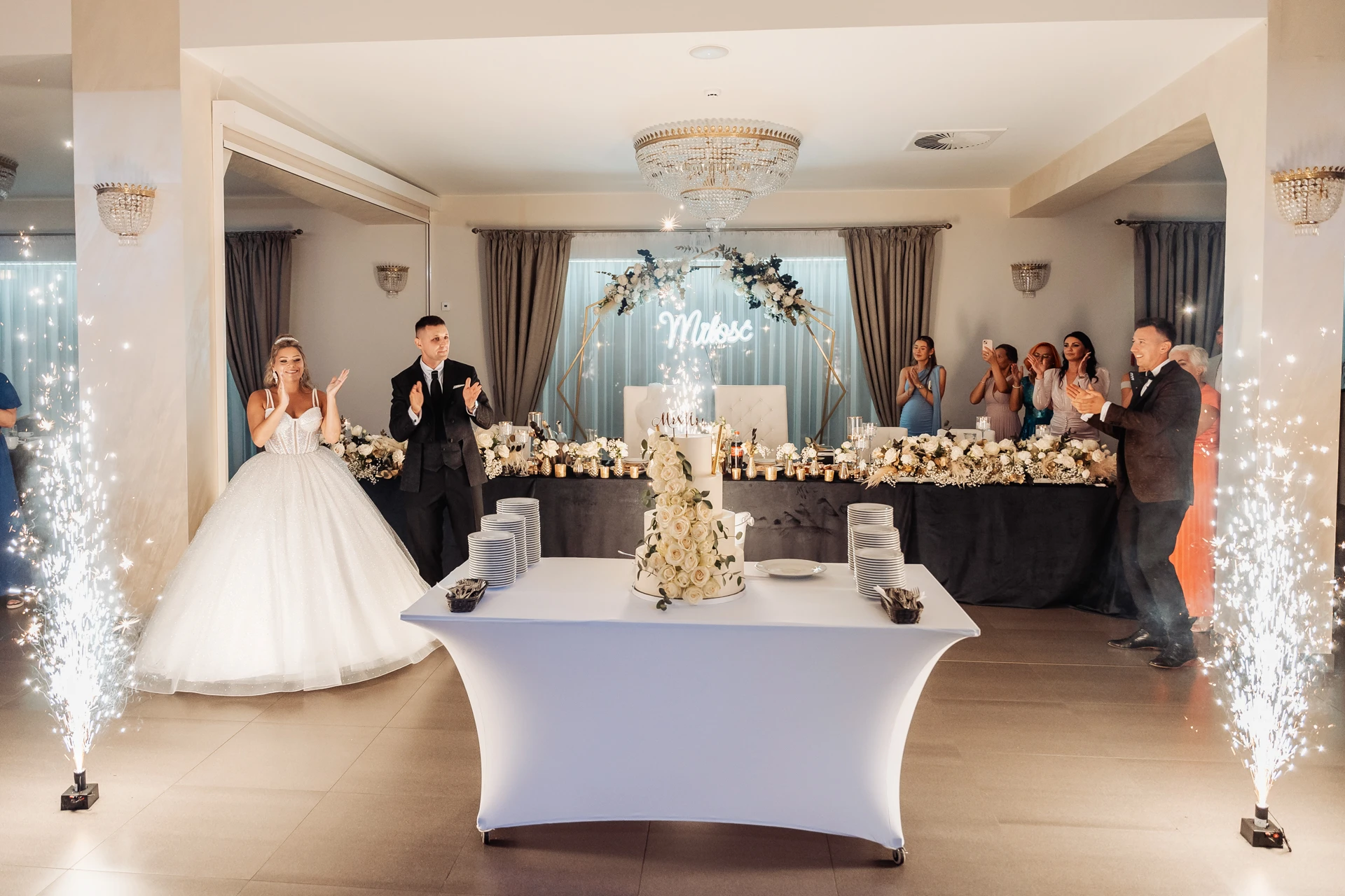 Sala weselna olśniewała luksusem – kryształowe żyrandole, złote akcenty i dopracowane detale sprawiły, że goście czuli się jak na królewskim przyjęciu. Wesele w stylu glamour to nie tylko estetyka, ale także wyjątkowa atmosfera – pełna radości i emocji.