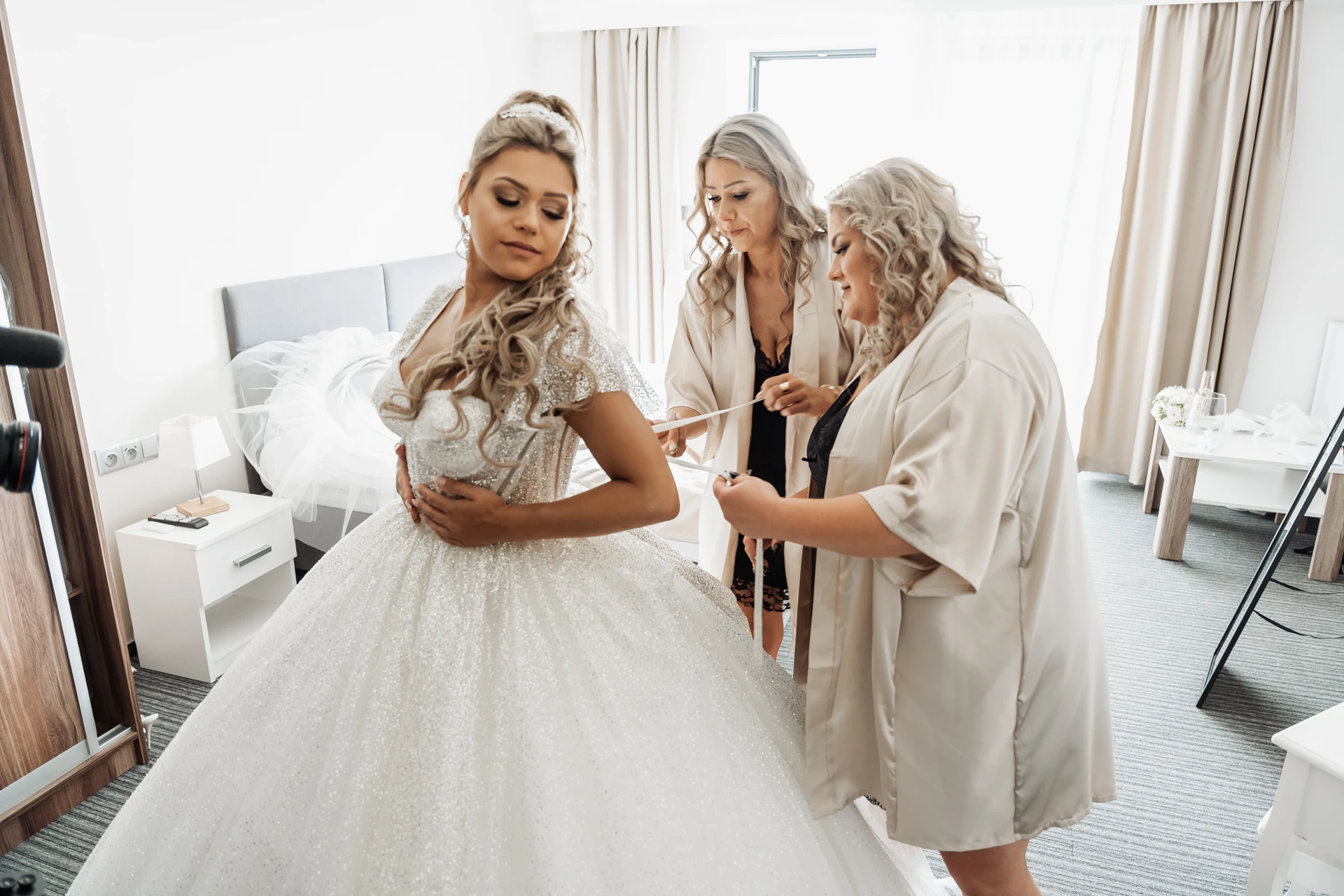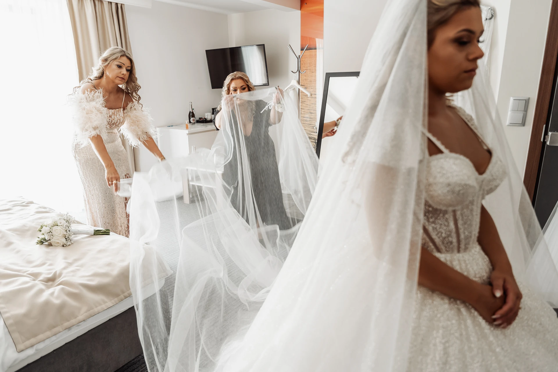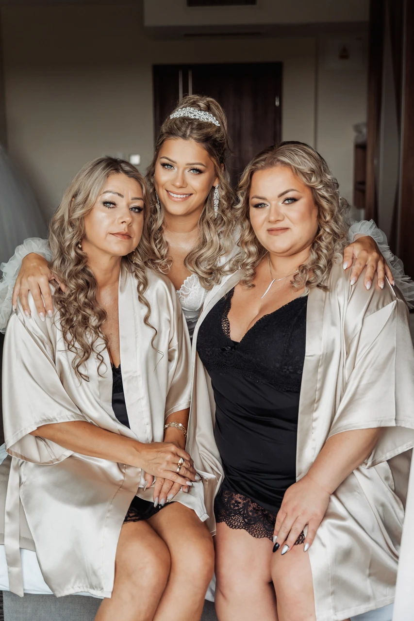 Dzień rozpoczął się w eleganckim apartamencie, gdzie Patrycja szykowała się do ślubu w otoczeniu najbliższych. Jej suknia – misternie zdobiona, lśniąca w świetle poranka – była prawdziwym arcydziełem. Obok niej – druhny w satynowych szlafrokach, pomagające dopiąć ostatnie detale.