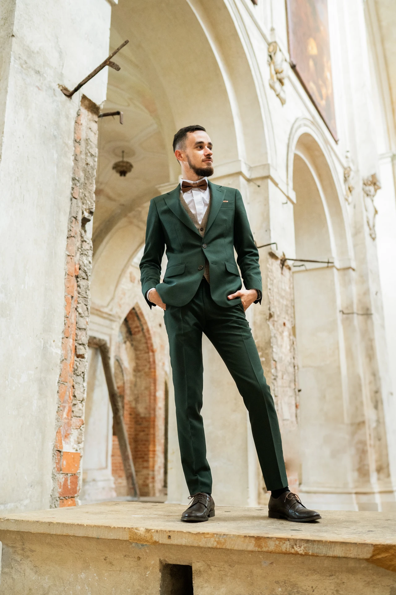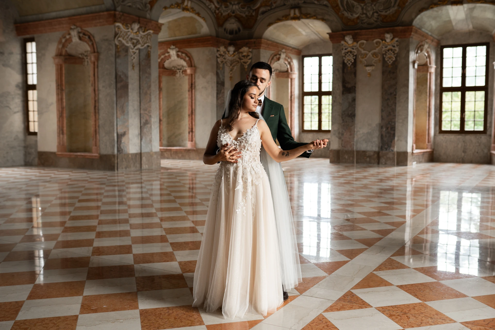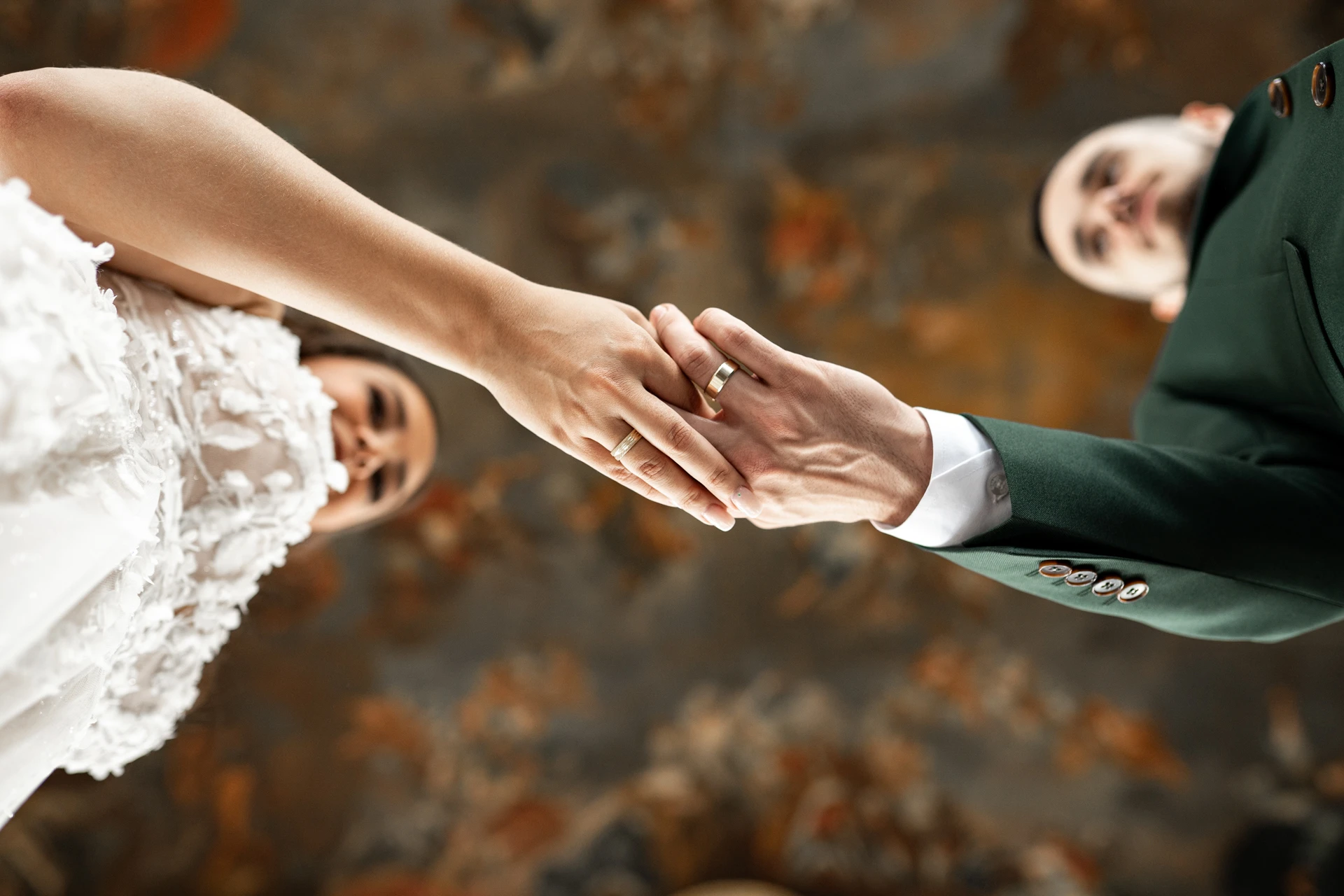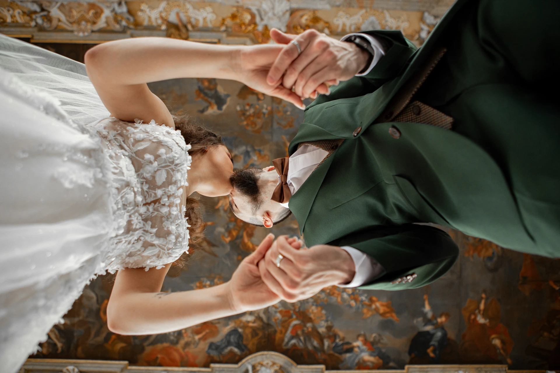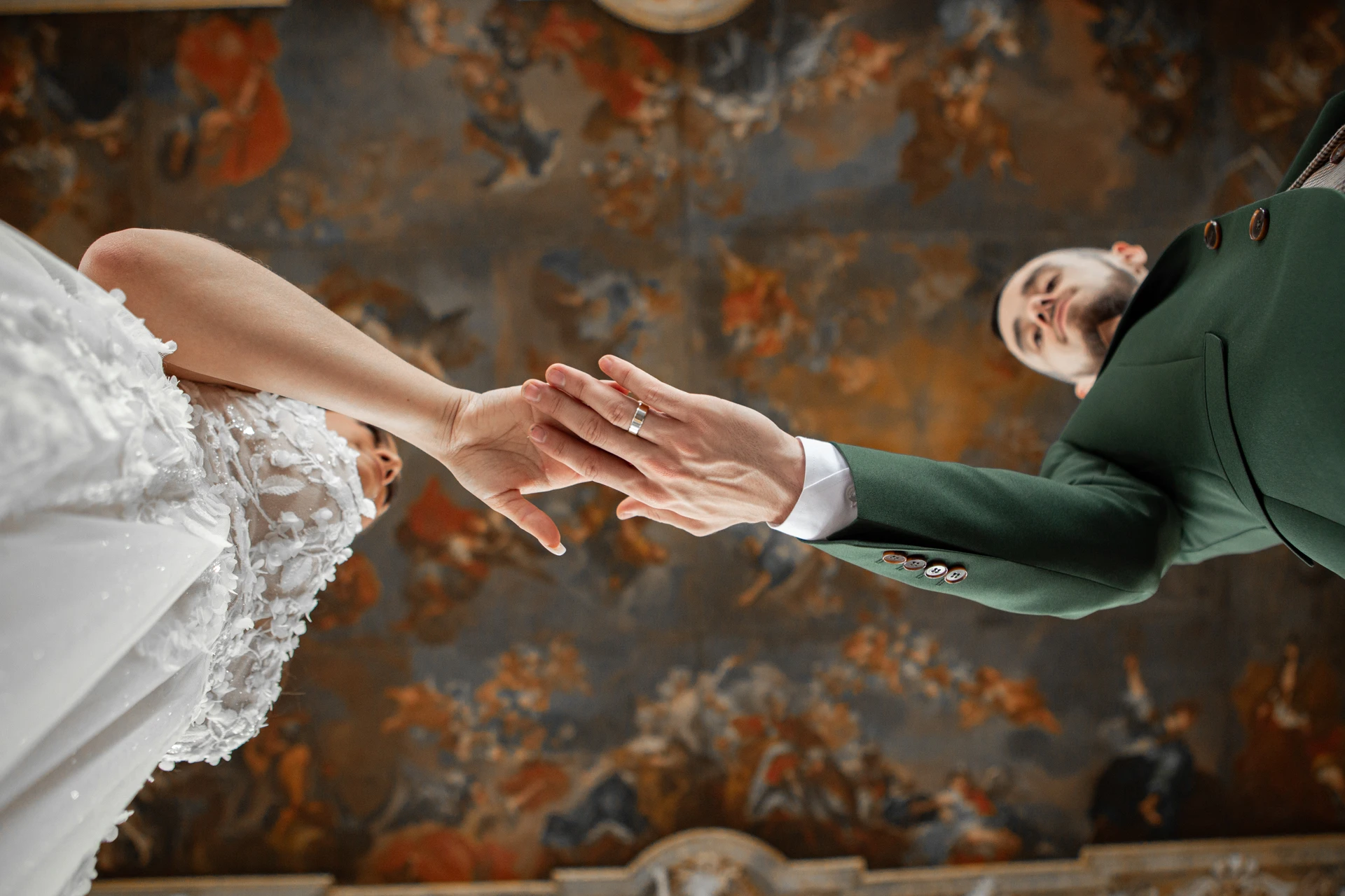 Ona – pełna wdzięku, w sukni o lekkim, zwiewnym kroju. On – w eleganckim, ciemnozielonym garniturze, pewnie obejmujący swoją ukochaną, jakby chciał chronić ich wspólne chwile przed całym światem.